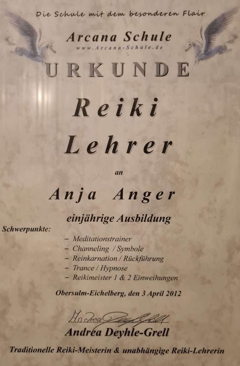 2011 habe ich nebenbei in Süddeutschland meinen Reikimeister und 2012 die Ausbildung zur Reikilehrerin inklusive Meditationstrainerin erfolgreich abgeschlossen - auch bekannt als Energiearbeit.